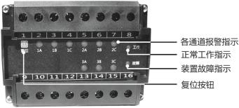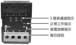 面板內(nèi)容 含義 1A、1B、1C 2A、2B、2C 3A、3B、3C 檢測各路運(yùn)行狀態(tài),當(dāng)任何一路保護(hù)時(shí),故障燈點(diǎn)亮。 工作 裝置正常運(yùn)行時(shí),每秒種閃爍一次 故障 裝置本身故障時(shí)點(diǎn)亮 復(fù)位 當(dāng)某路發(fā)生故障時(shí),在排除故障后按此鍵裝置恢復(fù)正常